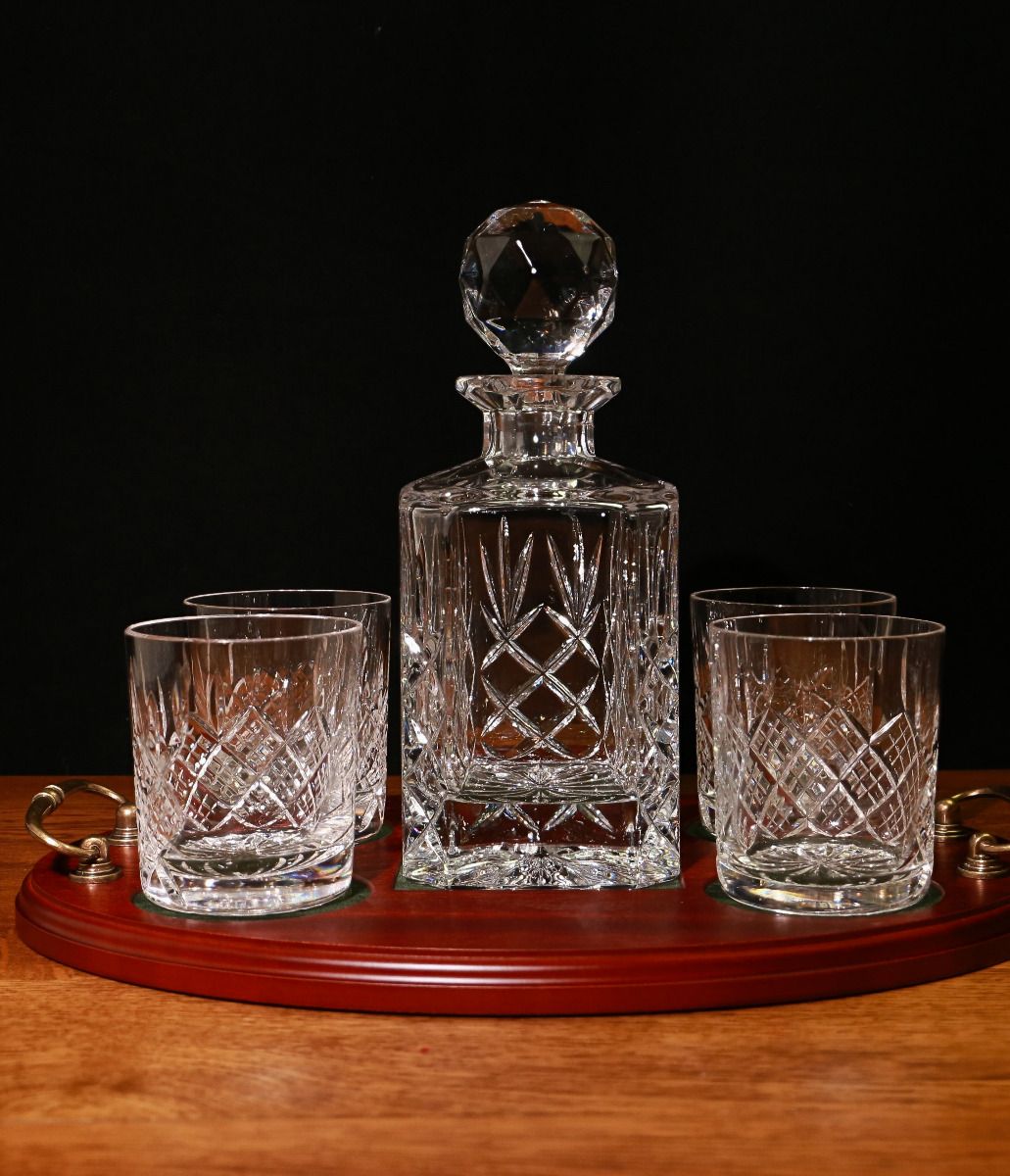 Store and enjoy your favourite tipple in style with this set of Crystal Whisky decanter and four glasses, presented on a handmade wooden serving tray with felt base and ornate brass hanldes. The clarity of the crystal with cutting catches the light to shine in a way that glass can never match.